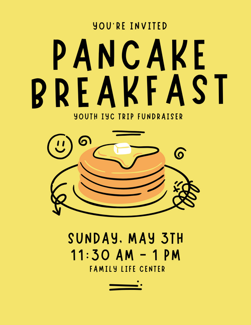 Join us for a Pancake Breakfast Fundraiser to support our youth as they raise money to attend IYC (International Youth Convention)—a powerful four-day experience filled with worship, teaching, and life-changing moments with God. The breakfast will be held in the Family Life Center, and donations are appreciated. Bring your family, invite a friend, and come hungry while supporting a great cause!